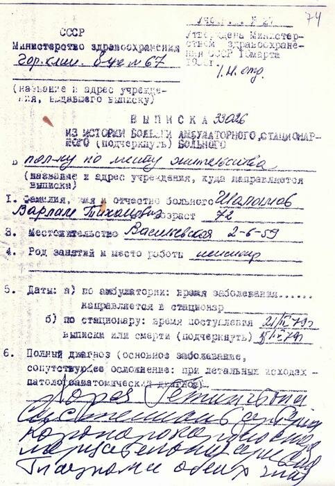 ...Шаламов сделал по поводу свой глухоты интересное наблюдение: «Зрение помогает слуху. Феномен освещенного телефона. В темноте не слышу звонок телефона, но если аппарат освещен — слышу. В чем тут дело? В напряжении нервов?» Окончательная глухота у писателя наступила спустя двадцать лет после дебюта болезни. 15 мая 1978 г. Шаламов пишет в дневнике: «Ушки мои полетели к чертям»... В 50-е гг. для лечения болезни (синдрома) Меньера применялись атропин с йодом внутрь, гистамин, кальций-диуретин с люминалом, стрихнин в каплях, препараты брома, какая-то примитивная физиотерапия. В общем, все это было одинаково бесполезно. До хирургического лечения (перерезки слухового нерва) дело не дошло. Известным эффектом обладал комплекс упражнений при болезни Меньера, предложенный в 1941 году Г. С. Циммерманом и В. Н. Мошковым, который Шаламов применял и много позже. После стационарного лечения ему была установлена сначала III, а затем II группа инвалидности. Кстати говоря, сохранилась выразительная запись Шаламова о Г. С. Циммермане: «Циммерман берет триста рублей (старыми деньгами) за визит, за приезд домой. Черт с ними, с ушами, если их надо спасать такой ценой». Биограф В. Т. Шаламова пишет: «Основной диагноз, поставленный... в 1957 году в Боткинской больнице, — болезнь Меньера, был подтвержден в 1970 году профессором Л. Н. Карликом, который... выписал ему специальную справку на случай происшествий на улице: „...Шаламов Варлам Тихонович, 1970 года рождения, страдает болезнью Меньера, выражающейся во внезапно наступающих приступах: внезапное падение, головокружение, тошнота, иногда рвота, резкое снижение слуха, нарушение равновесия. В случае появления приступа на улице... просьба к гражданам оказать больному помощь: помочь ему лечь, положить его в тень, голову обливать холодной водой, ноги согреть. Вынести на свежий уличный воздух..., только не на солнце. Не усаживать и не поднимать головы. Вызвать скорую помощь!“». Лев Наумович Карлик заведовал кафедрой патологической физиологии Рязанского медицинского института. Он ни одного дня не был врачом, тем более неврологом, так что его заключение — жест доброй воли, который должен был избавить Шаламова от задержания милицией и попадания в вытрезвитель. Писателя укачивало в метро, у него развивалось головокружение и рвота, и вызванные стражи порядка расценивали это как опьянение и действовали по инструкции. Примечательно, что В. Т. Шаламов был косвенно связан с Рязанью не только справкой Л. Н. Карлика. Шаламов был в Рязани в 1963 году, правда, проездом, а потом три дня прожил в Солотче, в доме А. И. Солженицына. Кстати говоря, В. Т. Шаламов оставил замечательный афоризм по поводу нашей литературы: «Вот в чем несчастье русской прозы, нравоучительной литературы. Каждый мудак начинает изображать из себя учителя жизни».