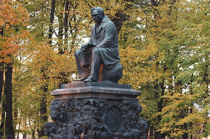 И. А. Крылов как человек творческий испытал триумф при жизни, 200 его опусов издавались до 1844 г. много раз суммарным тиражом 77 000 экземпляров, он стал гражданским генералом, был обеспеченным человеком. В 1825 году П. А. Вяземский, возражая Пушкину, написал: «Как ни говори, а в уме Крылова есть все что-то лакейское: лукавство, брань из-за угла, трусость перед господами, все это перемешано вместе… Представительство Крылова в нравственном, государственном отношении есть преступление, оскорбление нации…» Пушкин на это отвечал: «Ты уморительно критикуешь Крылова, молчи, то знаю я сама, да эта крыса мне кума. Я назвал его представителем духа русского народа, — не ручаюсь, чтоб отчасти он не вонял. В старину наш народ назывался смерд (от «смердеть» — плохо пахнуть. — Н. Л.). Дело в том, что Крылов преоригинальная туша». Добавлю, что и народ в долгу не остался. Когда спустя 11 лет в Летнем саду установили памятник Крылову работы П. Клодта, из-за постоянных намеренных повреждений (тогда бронзу в скупках тоже принимали!) здесь был выставлен полицейский пост для охраны и ограда, появилась такая эпиграмма: