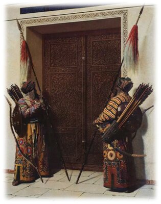 Мы мало что достоверно знаем о Тимуре. Известно, что он был крайне мстителен, коварен, бесстрашен и талантлив как полководец, но, прежде всего, бесконечно жесток. После каждого сражения его воины должны были приносить своим командирам несколько десятков отрубленных вражеских голов, получая за это вознаграждение. В иранском Себзеваре он заживо замуровал 2000 человек, в Систане и Кандагаре складывал башни из голов пленных, а взяв Дели, приказал (на всякий случай!) обезглавить 100000 жителей и сложить из голов огромные башни! В Дамаске он обезглавил 20000 и снова сложил из голов «апофеоз войны». Судьба потом жестоко посмеется над потомками Тимура, также обезглавленными. Тимур был жесток, но крайне расчетлив как политик: он нападал, когда противники были ослаблены внутренними распрями, он убивал, но наиболее умелых ремесленников уводил в плен и использовал их для украшения своей столицы. Судьба Делийского султаната постигла и Иран (1380-1393 гг.), где «башни Тимура» были сложены уже из 70000 голов. При этом он пересек все караванные пути, ведущие с Запада на Восток, и бдительно контролировал, чтобы караваны не шли в обход (по причерноморским и прикаспийским землям).